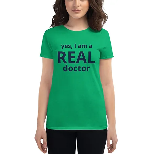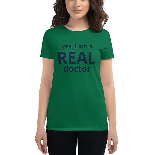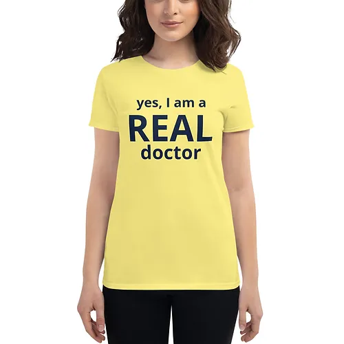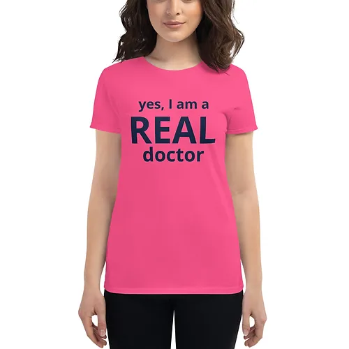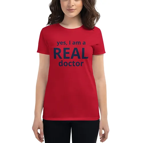 Women’s short sleeve t-shirt (Real Doctor, navy text)